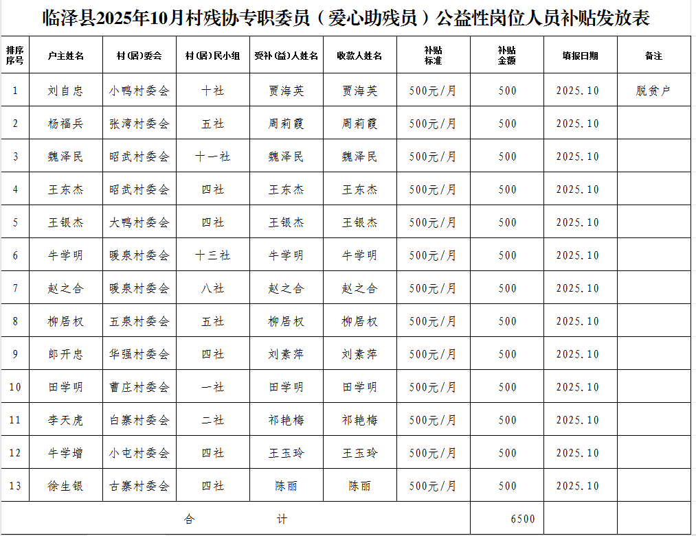 临泽县2025年10月村残协专职委员(爱心助残员)公益性岗位人员补贴发放表