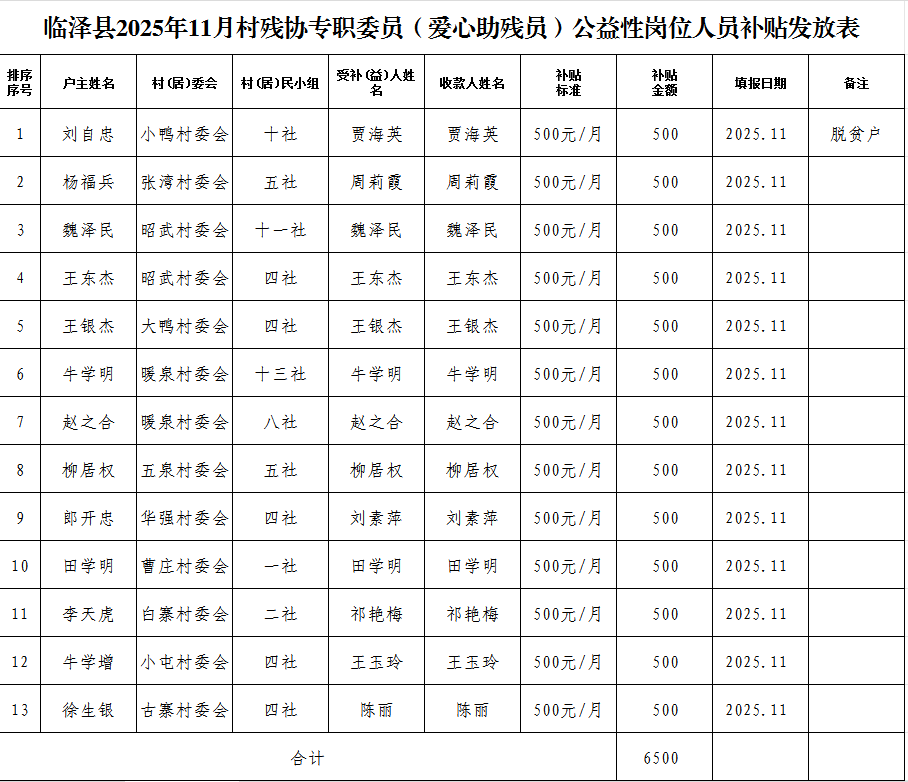 临泽县2025年11月村残协专职委员(爱心助残员)公益性岗位人员补贴发放表