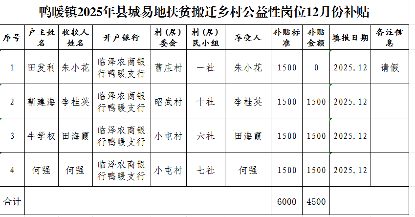 鸭暖镇2025年县城易地扶贫搬迁乡村公益性岗位12月份补贴