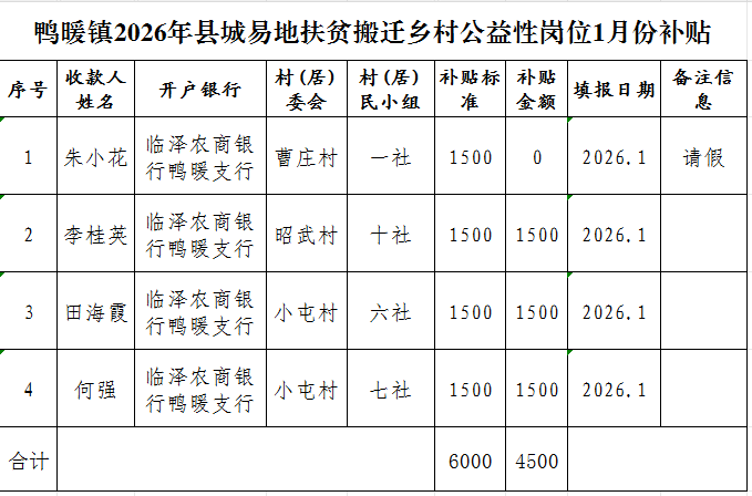 鸭暖镇2026年县城易地扶贫搬迁乡村公益性岗位1月份补贴