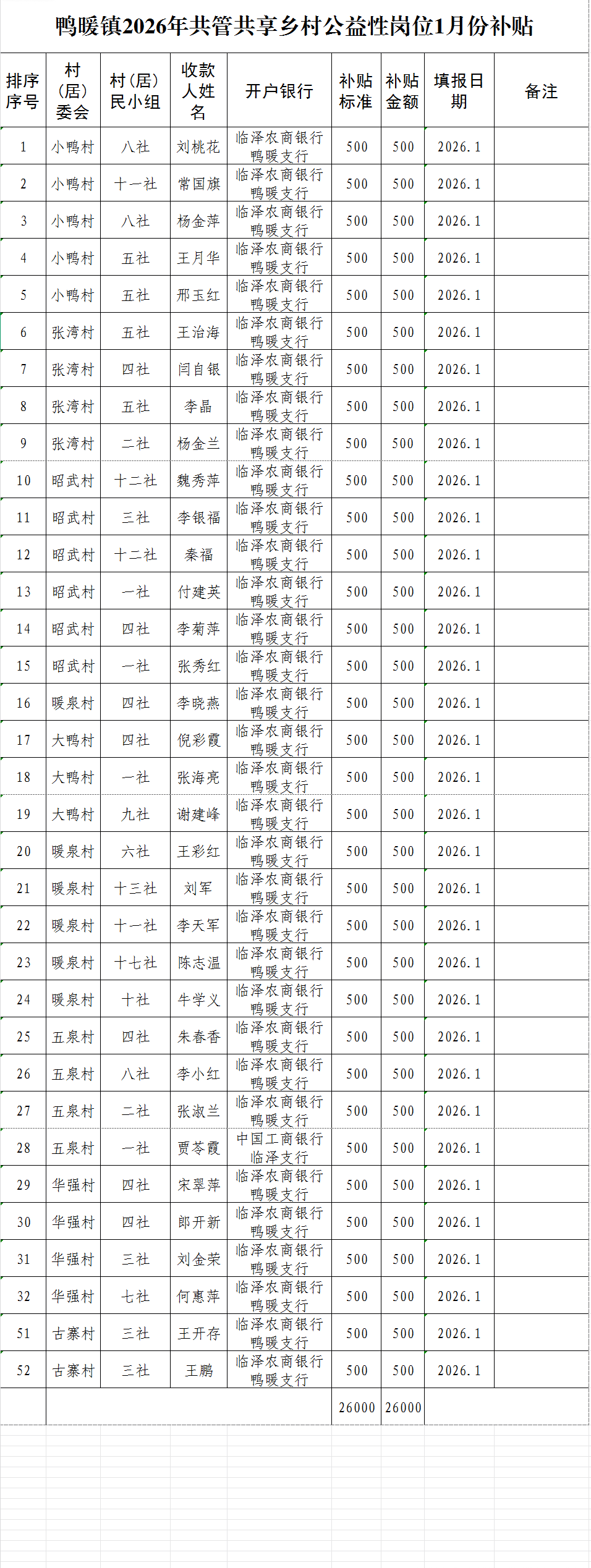 鸭暖镇2026年共管共享乡村公益性岗位1月份补贴