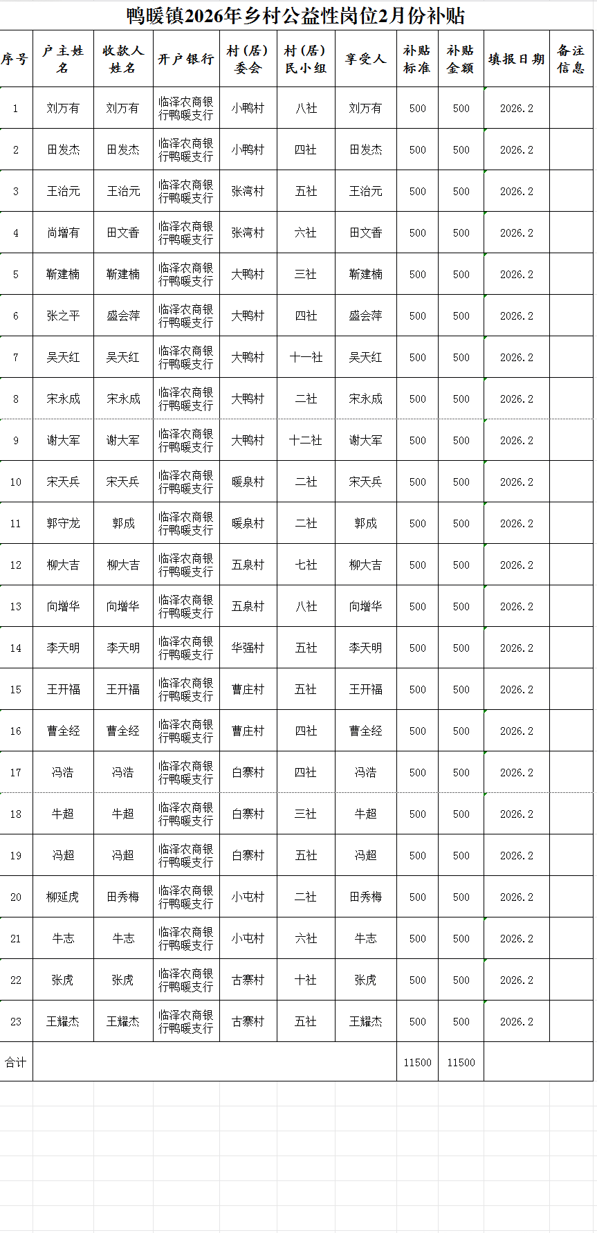 鸭暖镇2026年乡村公益性岗位2月份补贴