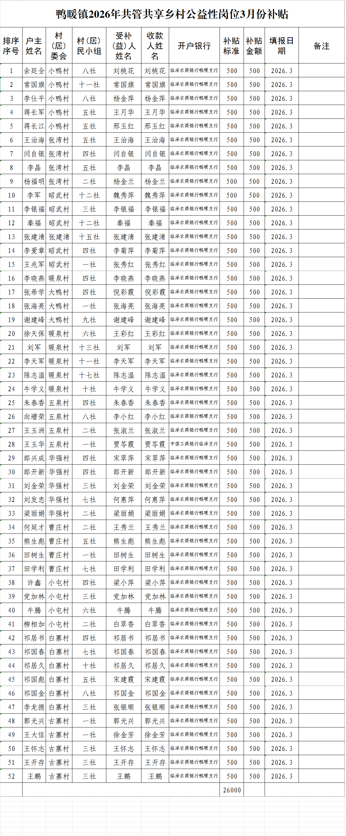 鸭暖镇2026年共管共享乡村公益性岗位3月份补贴