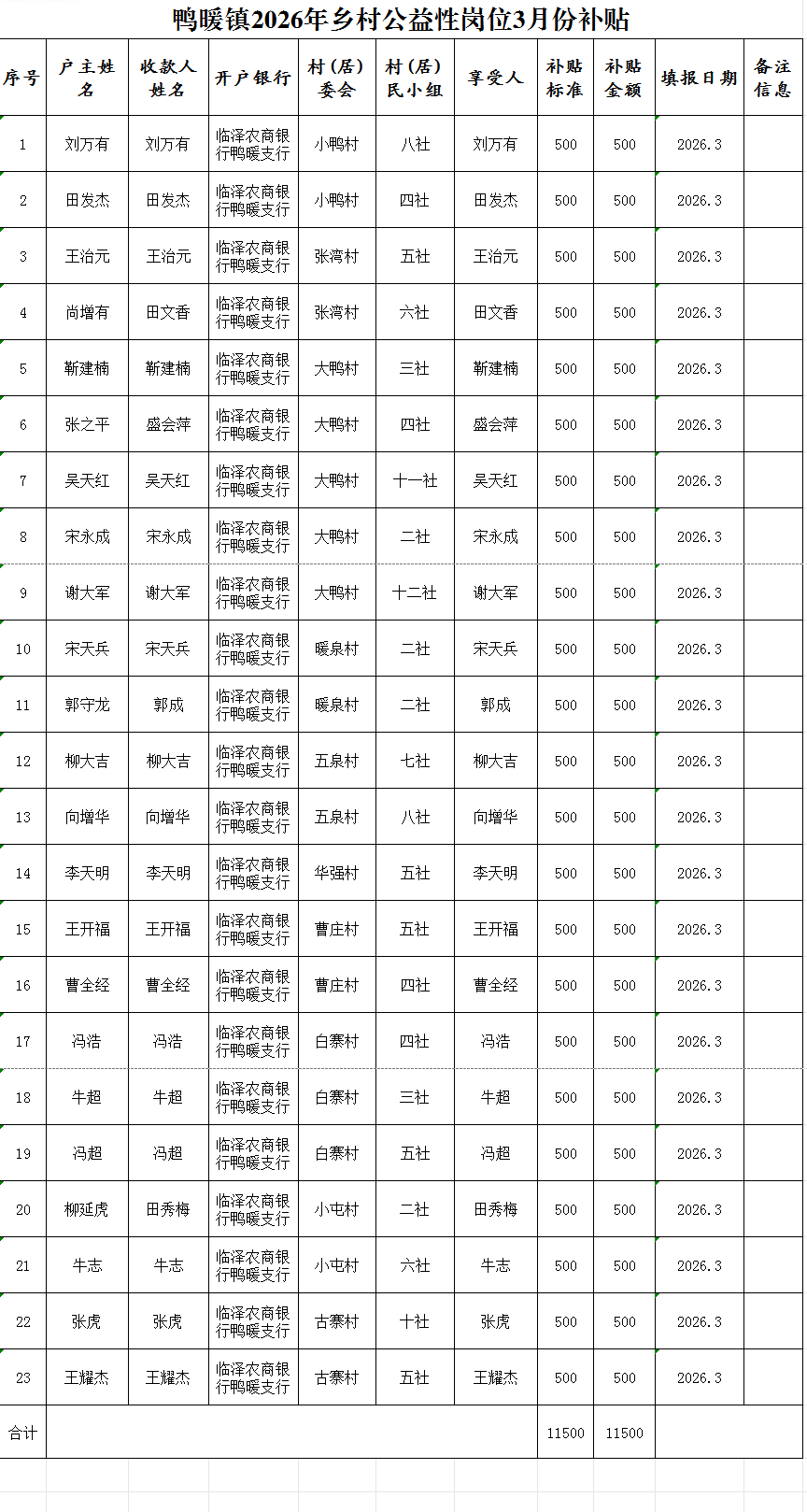 鸭暖镇2026年乡村公益性岗位3月份补贴