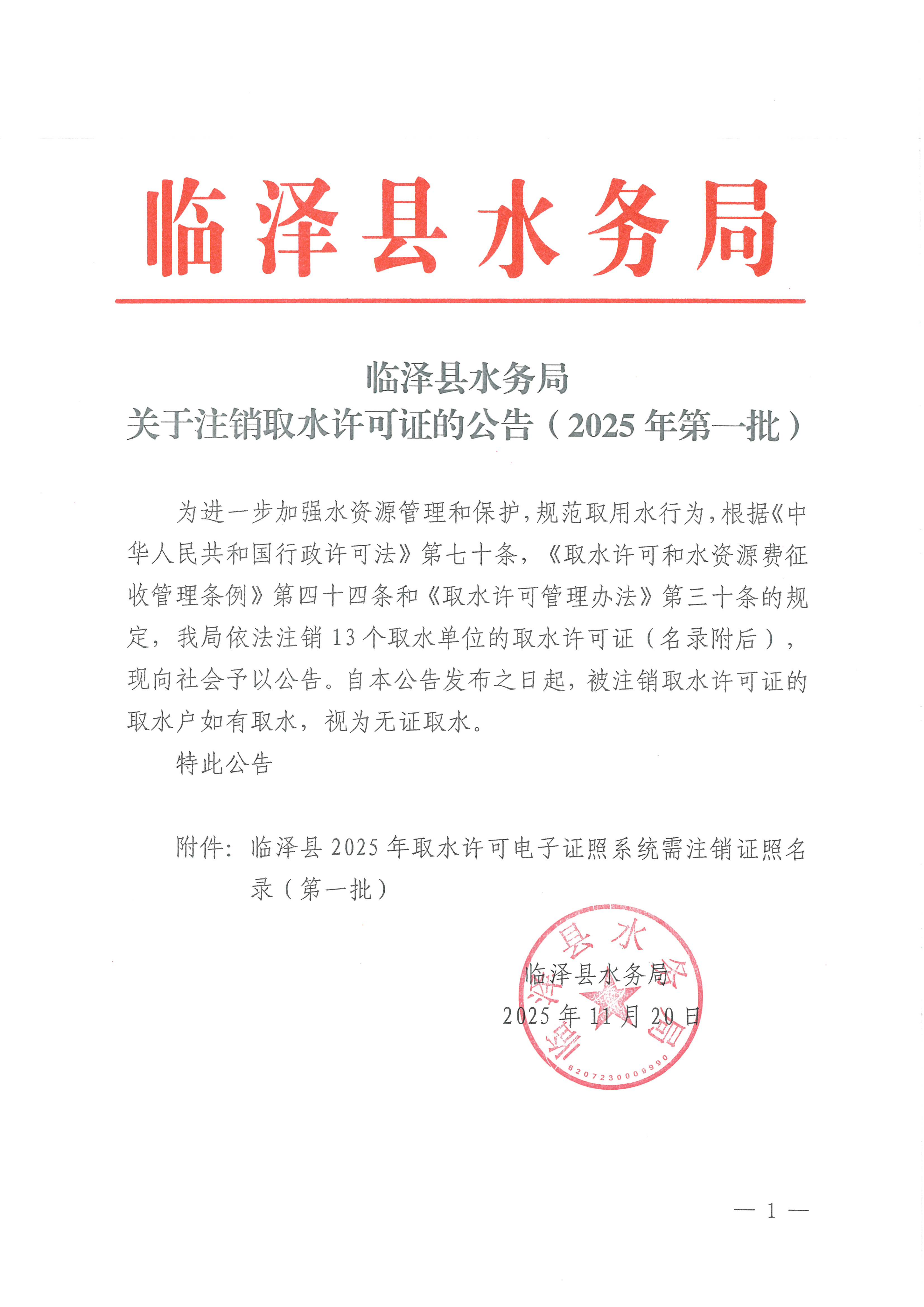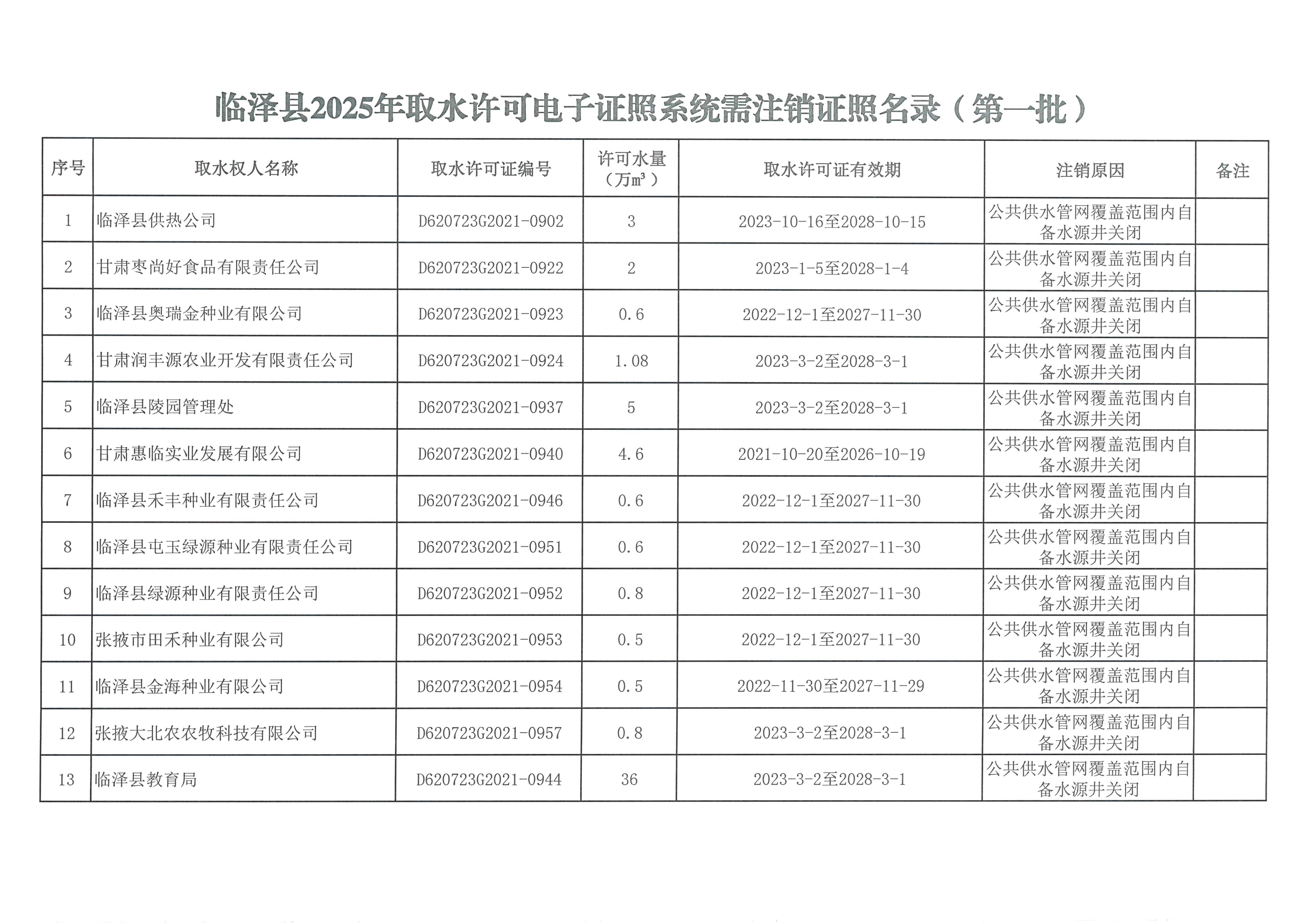临泽县水务局关于注销取水许可证的公告(2025年第一批)