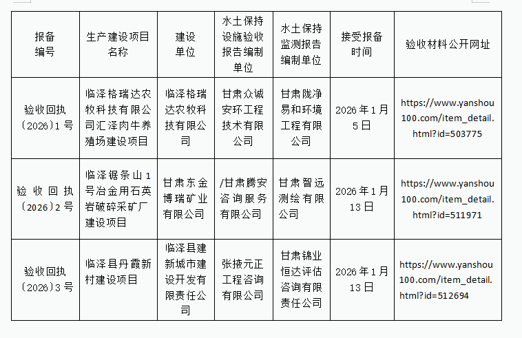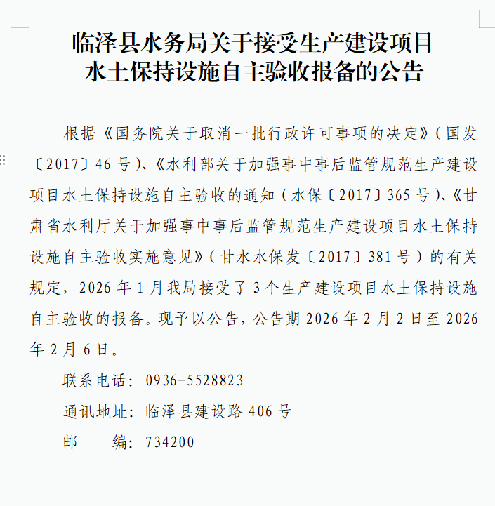 临泽县水务局关于接受生产建设项目 水土保持设施自主验收报备的公告