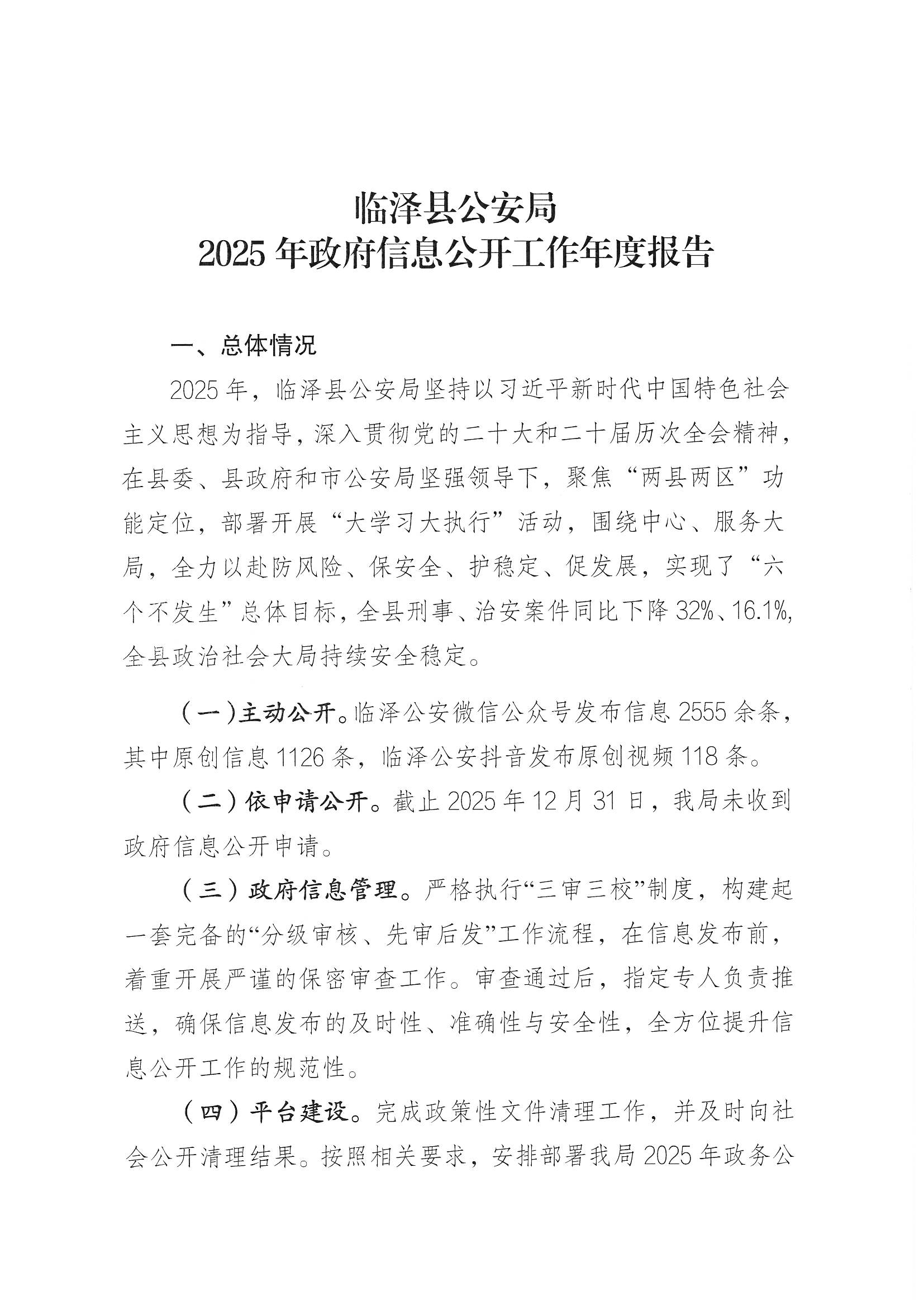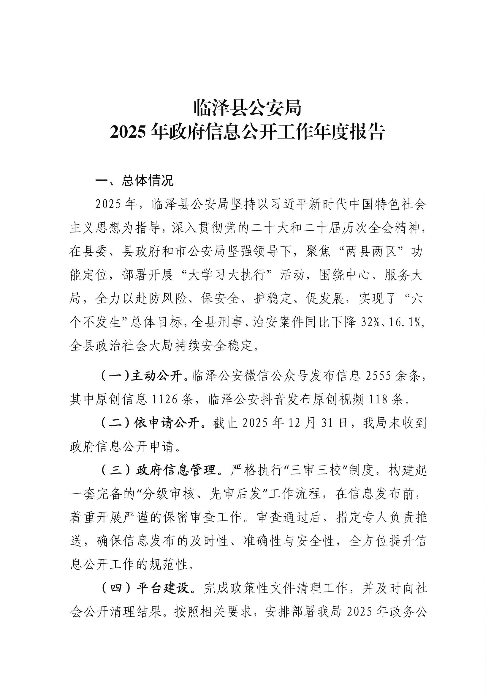 临泽县公安局 2025年政府信息公开工作年度报告