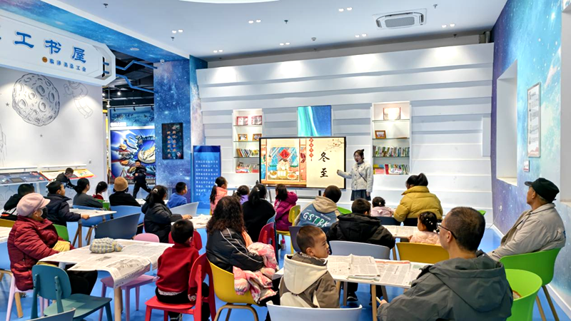 活动伊始,科普辅导员以精心制作的 PPT 课件为依托,既用通俗易懂的语言解读了冬至“太阳直射南回归线,北半球昼最短、夜最长”的科学原理,又生动介绍了“一候蚯蚓结,二候麋角解,三候水泉动”的节气物候特征。同时,课件以图文并茂的形式展现南北方冬至“北吃饺子、南食汤圆”的民俗差异,让参与者直观洞悉节气与自然节律、日常生活的紧密关联。随后,辅导员带领全体参与者齐声诵读《数九儿歌》:“一九二九不出手,三九四九冰上走……”朗朗上口的童谣不仅瞬间点燃现场氛围,更让大家在传唱间深切感悟古人以节气记录时序更迭的独特智慧。