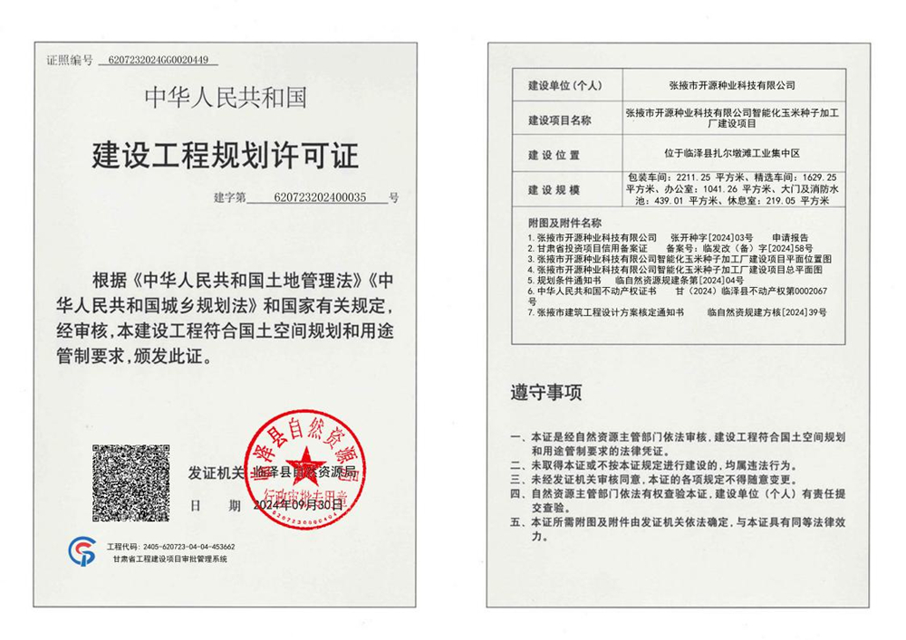 张掖市开源种业科技有限公司智能化玉米种子加工厂建设项目《建设工程规划许可证》公示