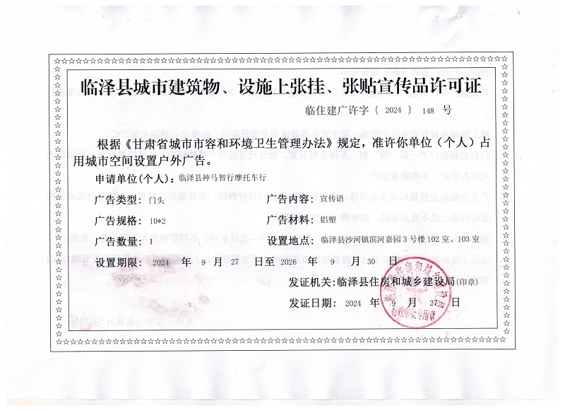 临泽县城管执法队对临泽县神马智行摩托车行户外广告的许可证