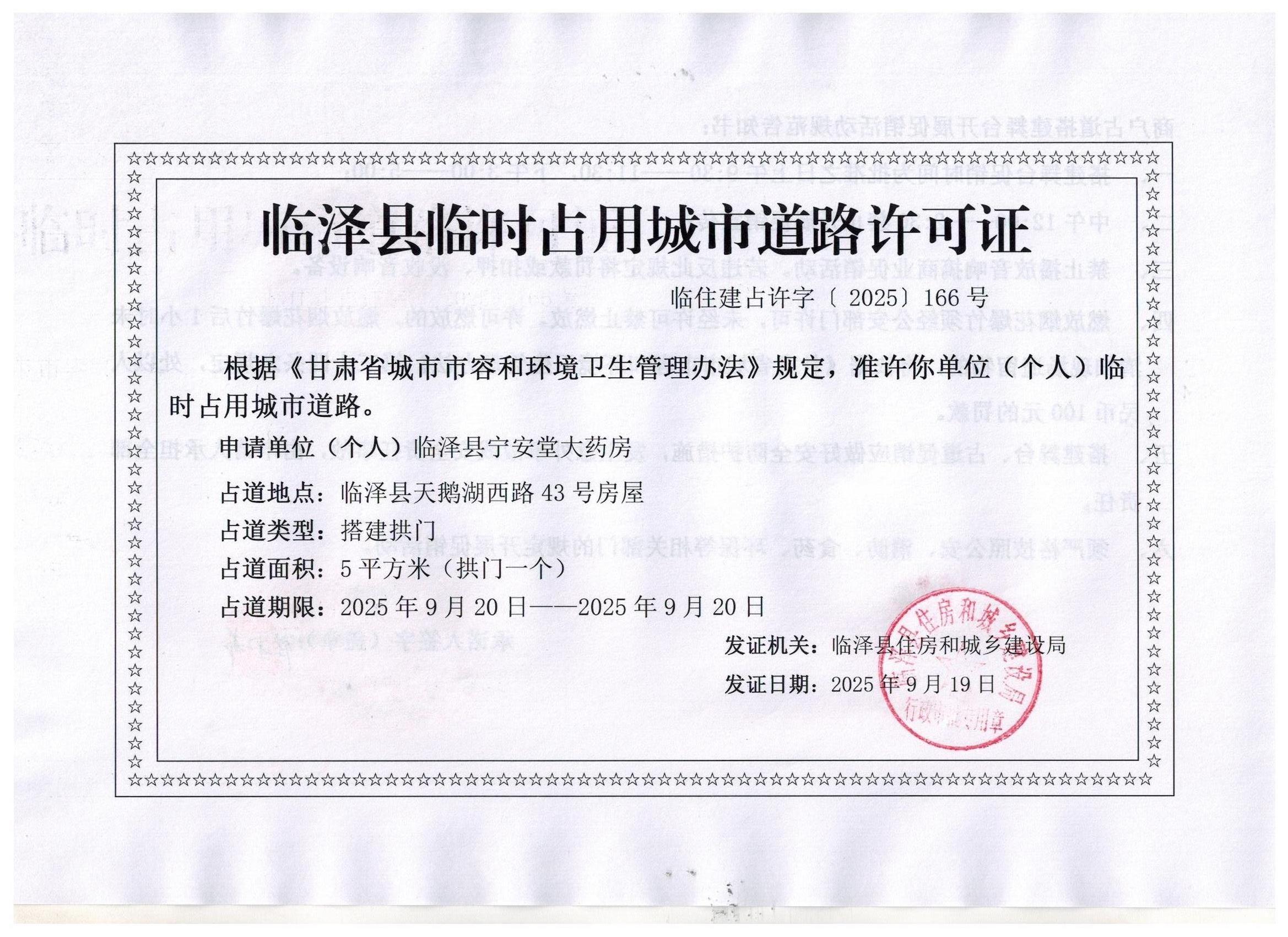 临泽县城管执法队对临泽县宁安堂大药房占道的许可证