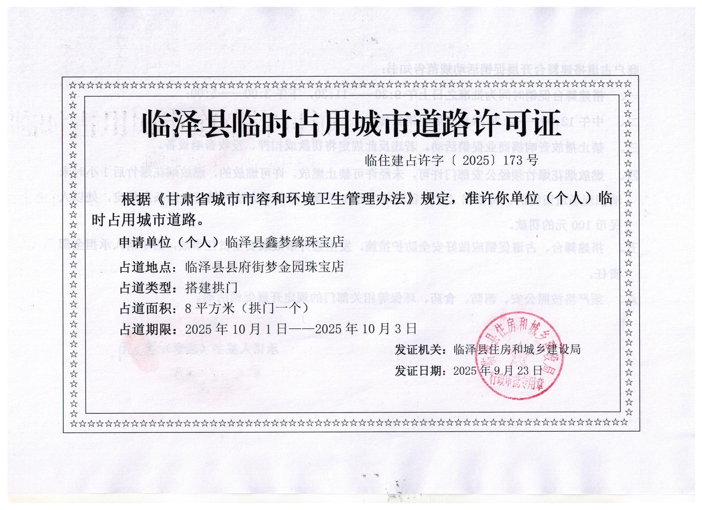 临泽县城管执法队对临泽县鑫梦缘珠宝店占道的许可证