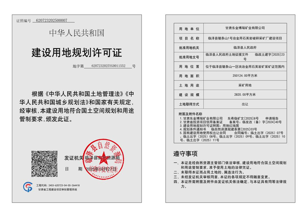 临泽县锯条山1号冶金用石英岩破碎采矿厂建设项目《建设用地规划许可证》公示