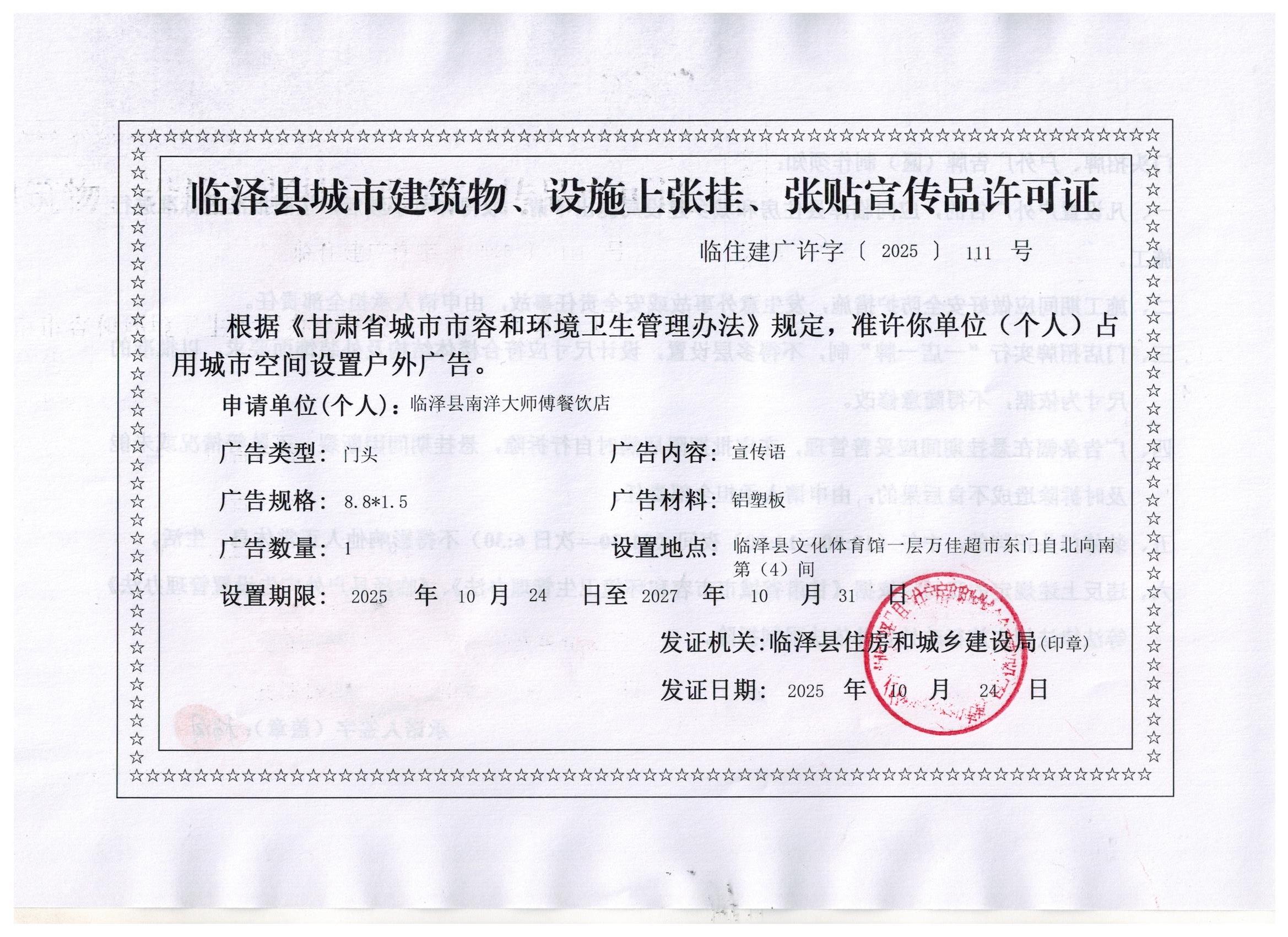 临泽县城管执法队对临泽县南洋大师傅餐饮店户外广告的许可证