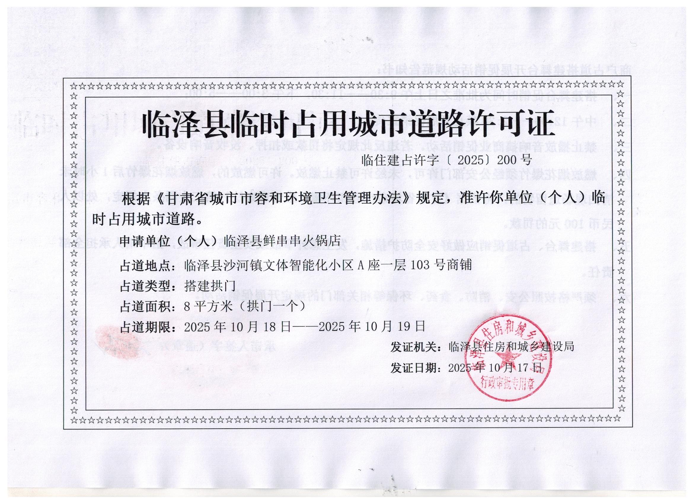 临泽县城管执法队对临泽县鲜串串火锅店占道的许可证