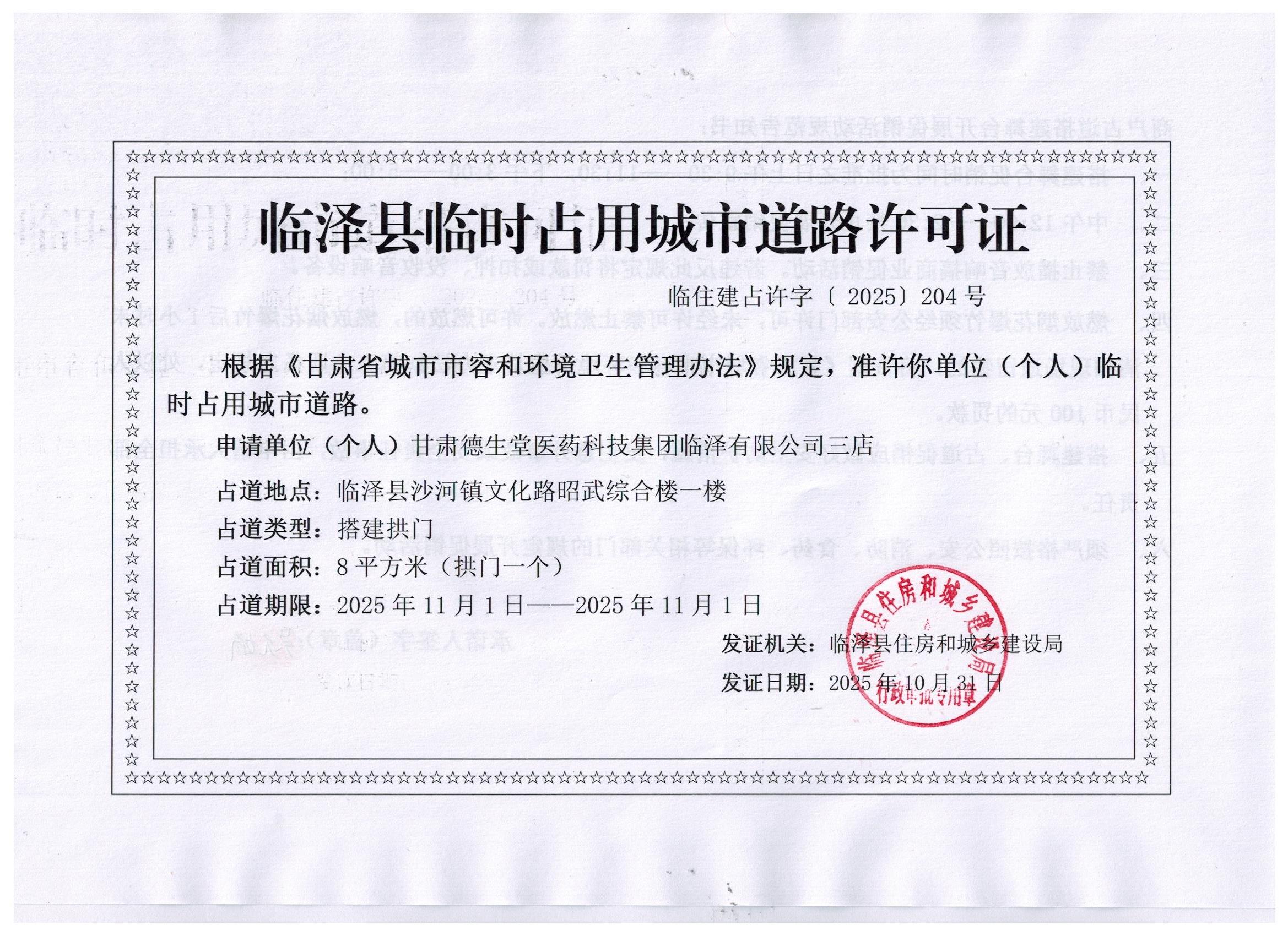 临泽县城管执法队对甘肃德生堂医药科技集团临泽有限公司三店占道的许可证