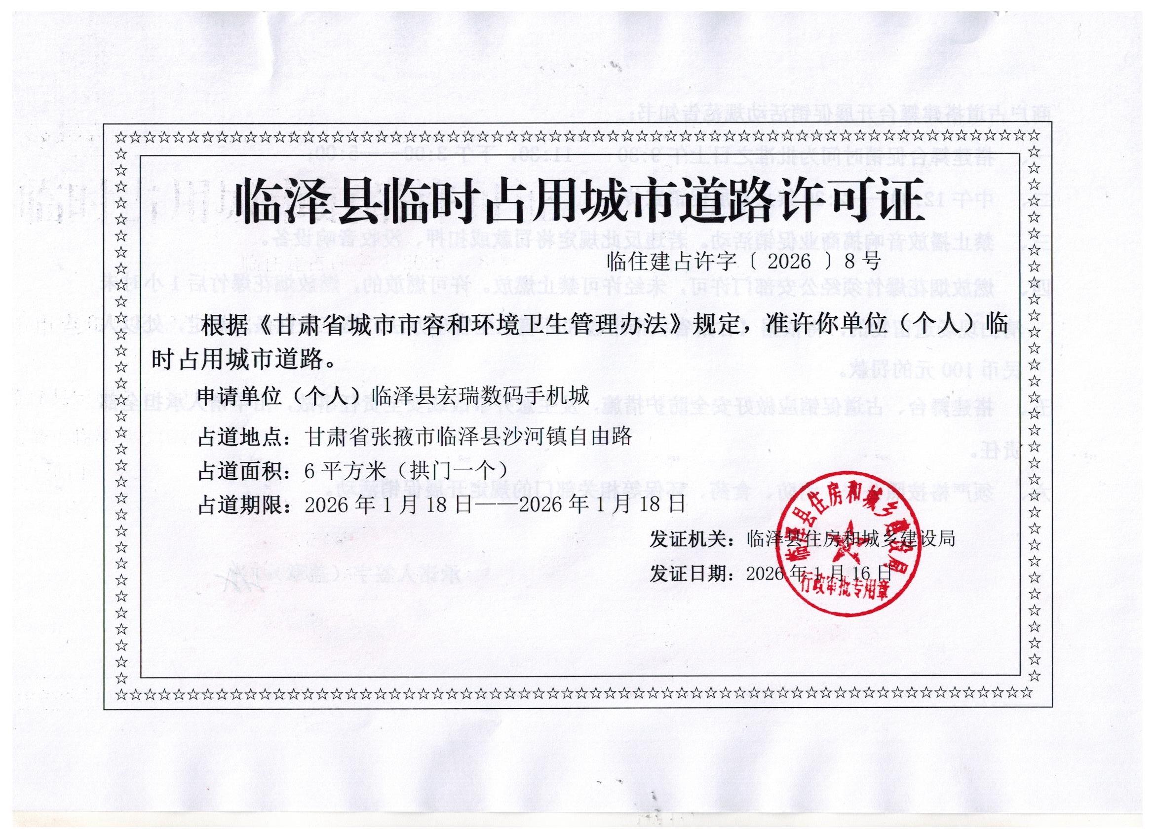 临泽县城管执法队对临泽县宏瑞数码手机城占道的许可证