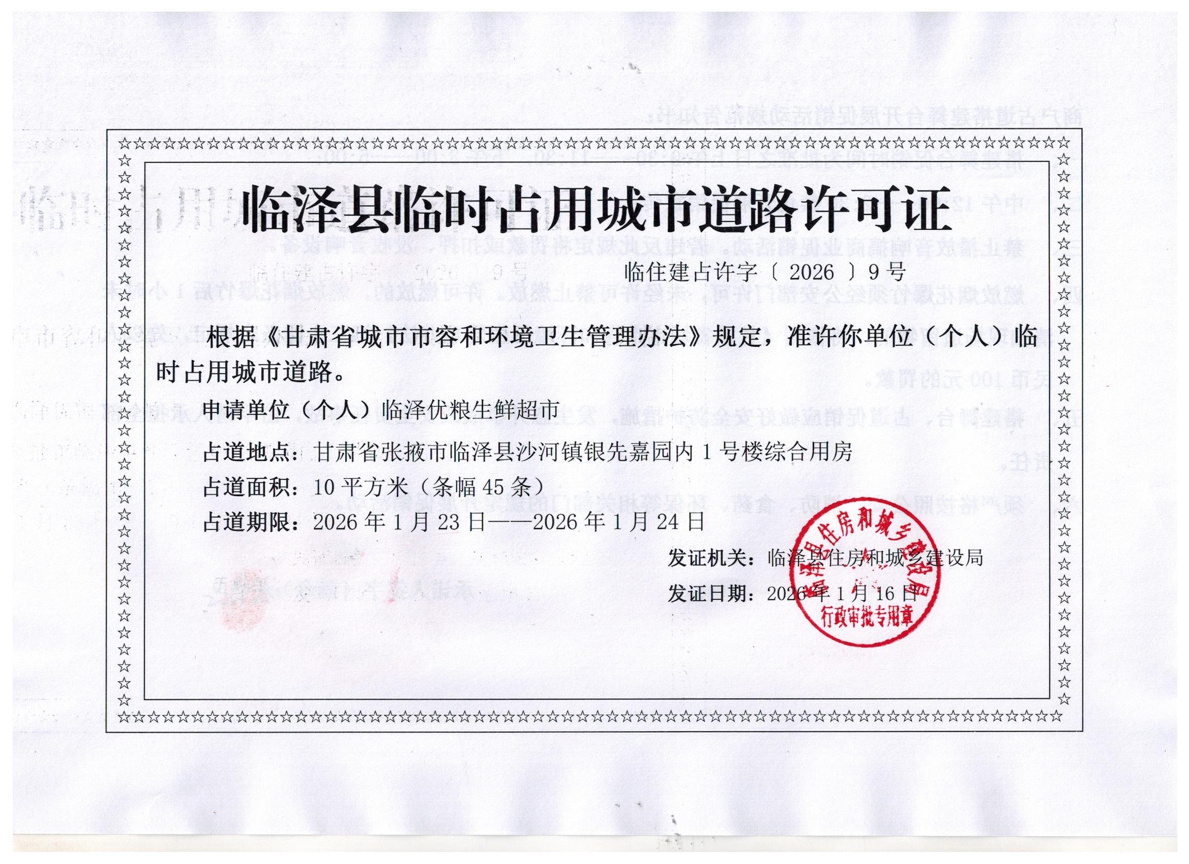 临泽县城管执法队对临泽优粮生鲜超市占道的许可证