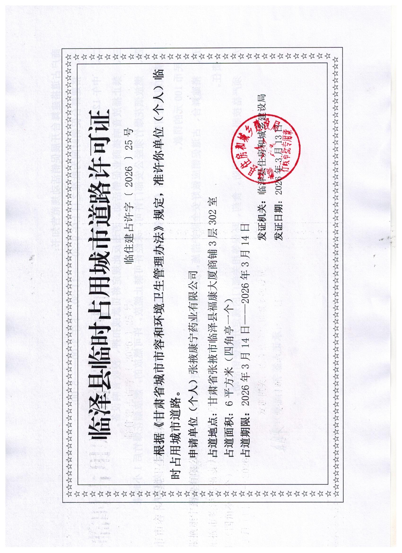 临泽县住房和城乡建设局对张掖康宁药业有限公司占道的许可证